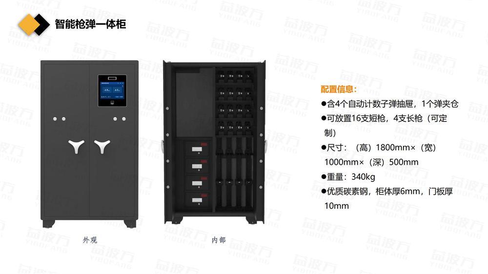 產(chǎn)品簡介: 一.智能聯(lián)動(dòng)手槍柜智能聯(lián)動(dòng)手槍柜主柜開關(guān)門效果圖尺寸1800(高)×1000(寬)×500(深)柜體厚度柜體6mm、柜門8mm柜體材質(zhì)優(yōu)質(zhì)碳素鋼、軍綠色柜體重量≥220kg柜內(nèi)規(guī)格48支手槍,軍刺、子彈袋、彈匣、擦槍布、槍墊、油壺等控制器12寸高清電容觸摸屏、指紋識(shí)別功能、人臉識(shí)別功能等槍支在位檢測微動(dòng)開關(guān)柜門開啟電控、